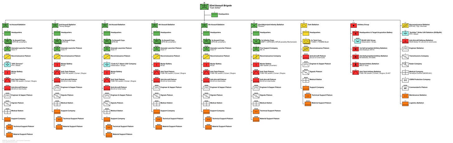92nd Assault Brigade "Ivan Sirko" is a Ukrainian Brigade with a long history, even taking part in fighting in Iraq. The unit distinguished itself during the ATO and, at the beginning of the full-scale invasion, it successfully defended its hometown of Kharkiv. It was later the main mechanized force in the 2022 Kharkiv Oblast counteroffensive and took part in fighting around Bakhmut in early 2023 with one or more of its Battalions holding the “Road of Life” line of communication.